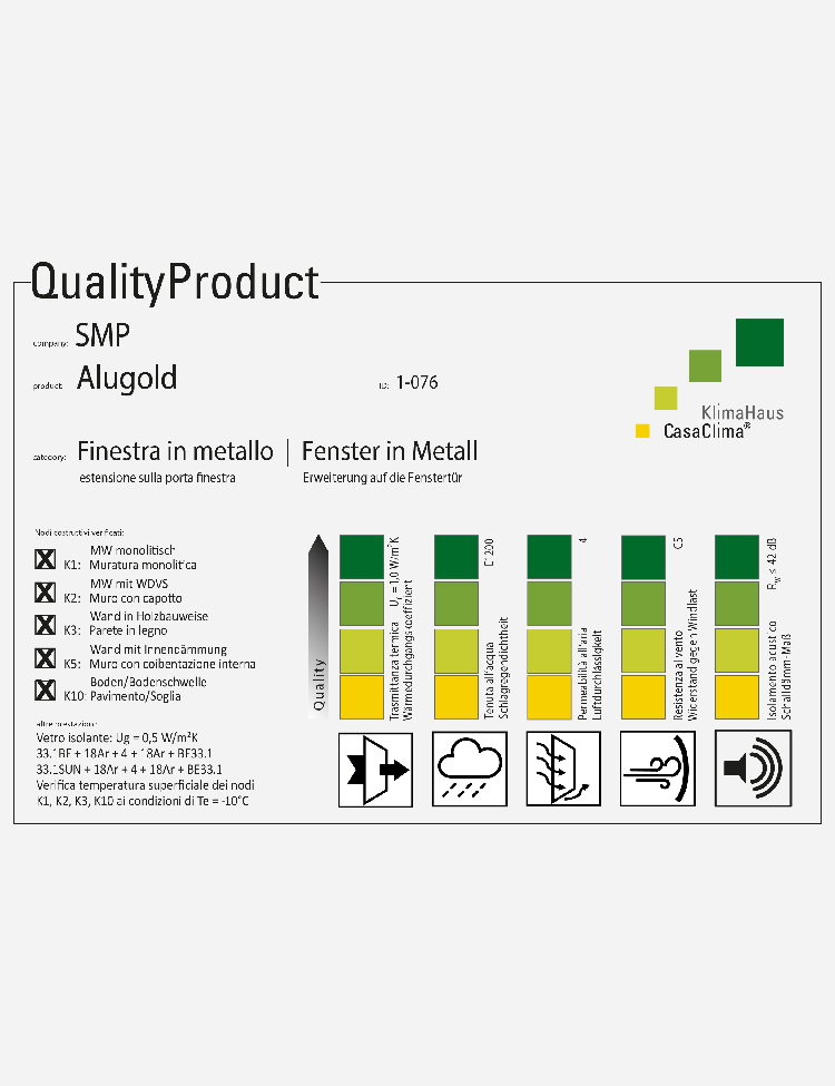 Queste eccezionali qualità hanno permesso di insignire il nostro modello Alugold® della certificazione “FinestraQualità” classe Gold rilasciato dall’ Agenzia CasaClima di Bolzano.