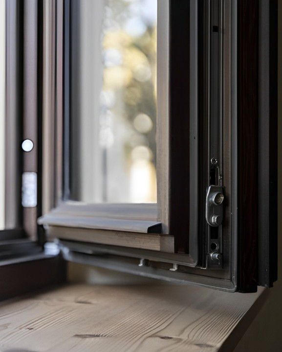 Un gocciolatoio in legno e i fermavetri profilati conferiscono al serramento un aspetto minimale ed elegante.