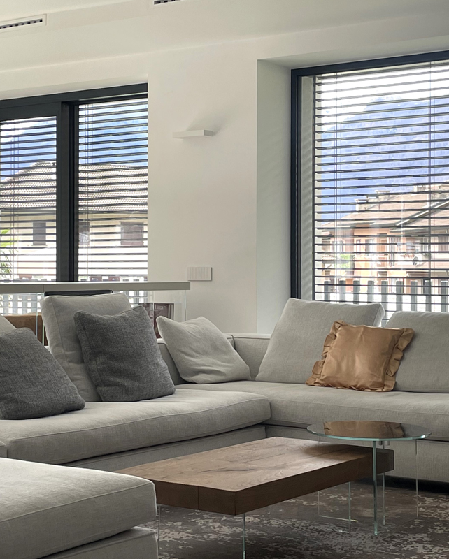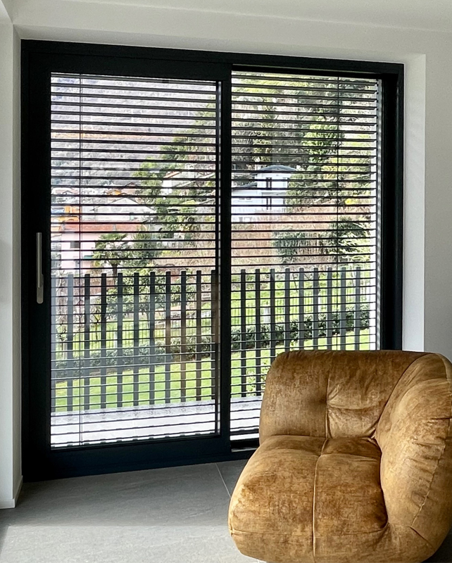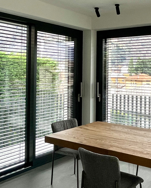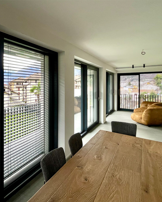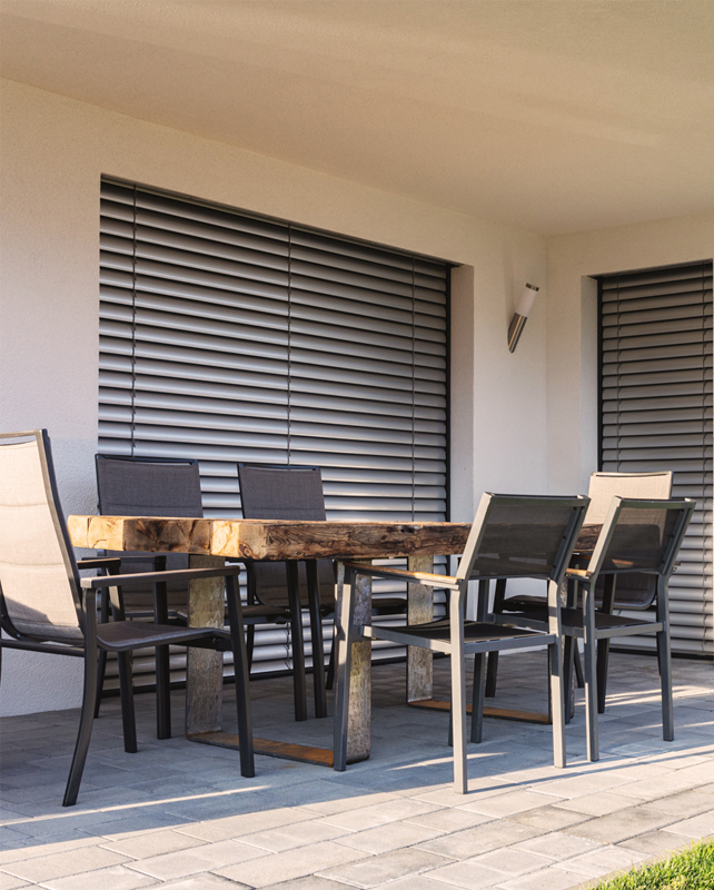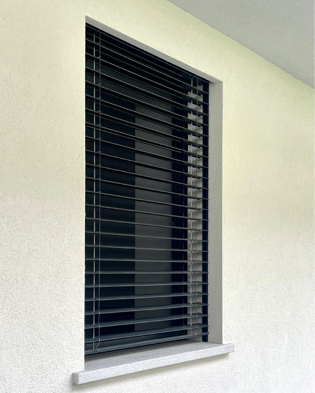 Un frangisole sottile con lamelle bordate a S o Z dello spessore di 0,45 mm e con una larghezza di 63 mm offre una protezione ideale dal sole, dagli sguardi indiscreti e dal calore, oltre a un oscuramento perfetto degli ambienti.