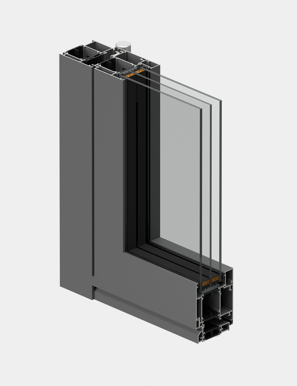 Struttura complanare lato interno ed esterno, telaio isolato con 3 guarnizioni, soglia a pavimento a taglio termico con doppia battuta in EV1 anodizzato argento.