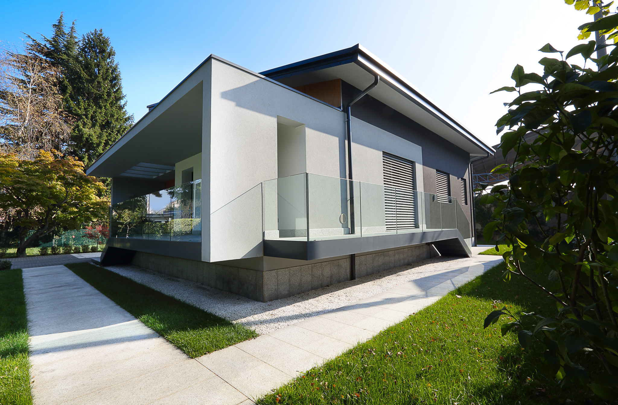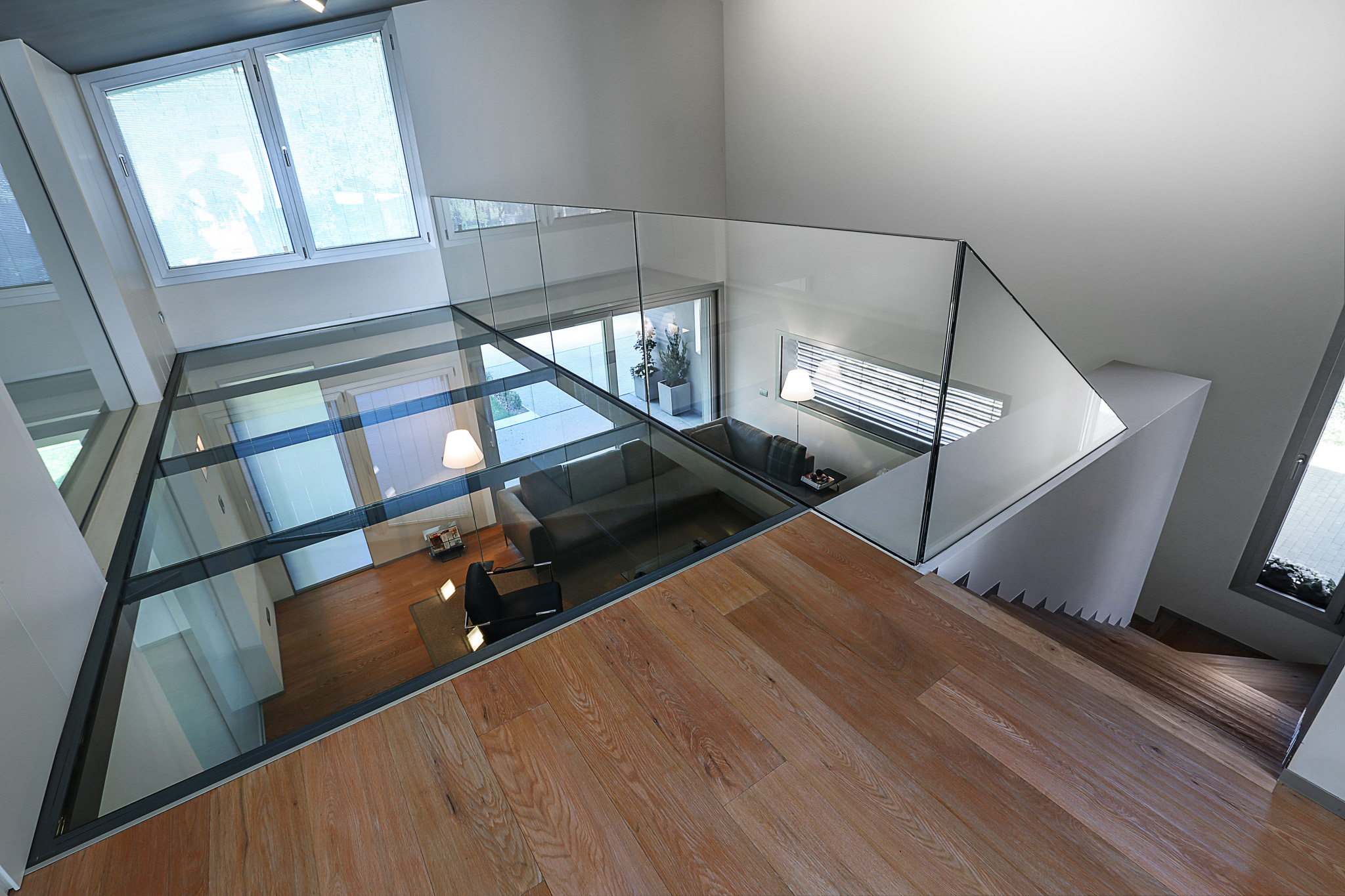 Gli infissi sono stati realizzati su misura, rispecchiando il design moderno e innovativo dell’intera residenza. In particolare, il soppalco con pavimento e parapetto trasparenti consentono una vista straordinaria del soggiorno dall’alto, valorizzando ulteriormente il design unico di Villa Meroni.
